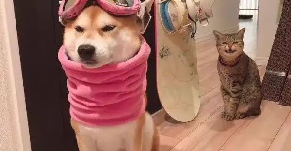 主人在給柴犬試衣服,後面的貓咪竟在偷笑:這位同學請克制一下